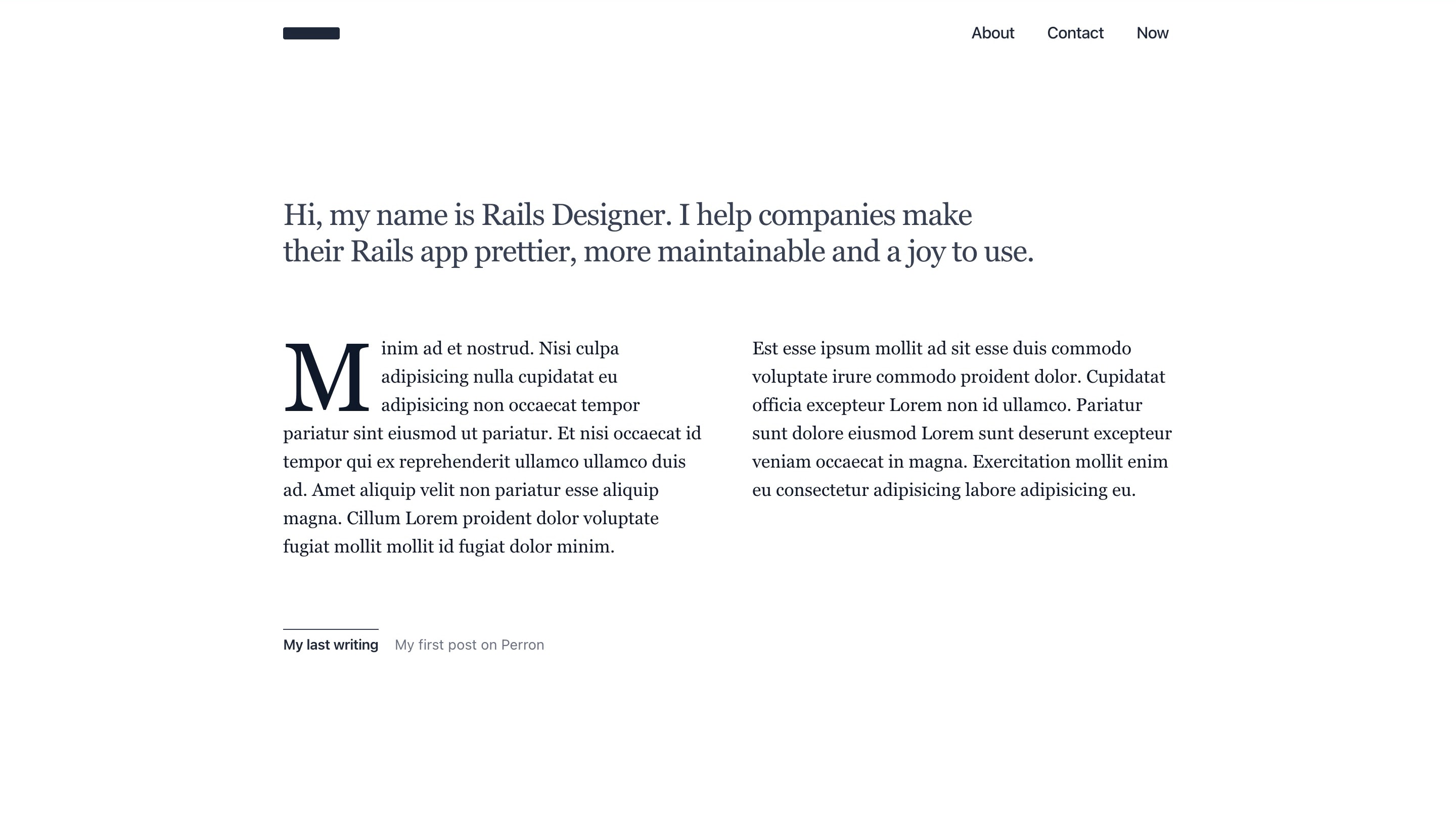This template for a minimal and stylish personal blog is designed with Tailwind CSS. It features static pages, like about and contact. And next to that a Content::Post + views to showcase all your writings in a clean and minimal visual design.